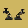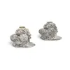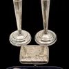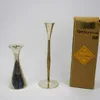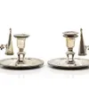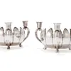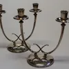 Pair of modernistic small 3 arm candlesticks. Loaded bases. Birmingham 1960, Bishton's Ltd. One arm detached. Total weight probably around 80 g.