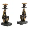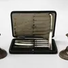 Adie Brothers, a pair of Queen Elizabeth II silver dwarf candlesticks, Birmingham 1955, 10cms high. Together with a cased set of six silver pistol handle butter knives