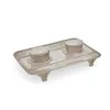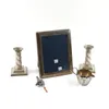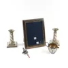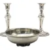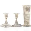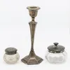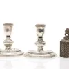 A GROUP OF SILVER MOUNTED WARES (4) — Comprising; a pair of candlesticks, Sheffield 1908, sample height 14cm, a capstan form inkwell, hallmark rubbed, diameter of base 12.5cm and a table cigarette box…