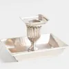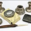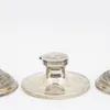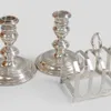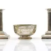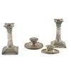 TWO SILVER MOUNTED INKSTANDS AND A PAIR OF SILVER TABLE CANDLESTICKS (4) — The circular inkstand, Birmingham 1917, the oval inkstand, Birmingham 1921, the Corinthian column candlesticks, London 1911, …