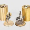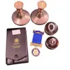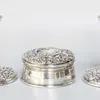A pair of silver dwarf candlesticks, Birmingham 1960, 7cm high, two small circular boxes with inlaid tortoiseshell covers and a 925 silver git and enamel medal "Past Past President Rotary Internationa…