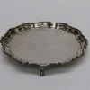 A sterling silver Elkington footed salver. Hallmarked for Elkington and Co Ltd, Birmingham 1899. With scrollwork rim and scroll footed feet, with engraved design to the centre. Approximate diameter 35…