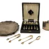 A Georgian style hallmarked silver muffin tray with handle. Bow decoration with Centre engraved 'P' Circa 540gram Includes boxed hallmarked silver teaspoons x5 (1missing) and sugar tongs. also engrave…