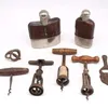Two antique leather covered hip flasks and a quantity of corkscrews and bottle openers.
