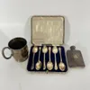 A boxed set of six silver golfing spoons and a silver tankard 7.5cm tall (no engraving) and a silver hipflask 10cm tall (engraved). Total weight approximately 252 grams.