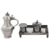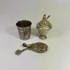 A white metal lidded incense burner - approx 13cm tall. An embossed 800 silver Eartery beaker and a white metal hanging bottle shaped pot pourri with oneutral type marks. Total approx 15cm tall.