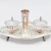 A silver ink stand, with inscription dated 1858, London 1786, Daniel Smith and Robert Sharp, ink bottles date to 1856, one top a/f, 375g