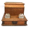 A mixed lot comprising: an early to mid 20th century oak stationary desk set with hinged top revealing letter rack with two glass inkwells to front; a modern wooden letter rack; a 20th century inlaid …