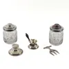 A PAIR OF LIDDED GLASS JARS AND THREE FURTHER ITEMS (5) — Each jar having a leather lined pull-off stopper, unmarked, sample height 13cm, also a silver mounted capstan shaped inkstand, Birmingham 1920…