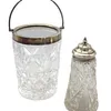 A Modern silver mounted cut glass ice bucket, with silver swing handle to top, hallmarked Birmingham, 1993, approx. 15cm high excluding handle, together with a George V silver topped cut glass sugar c…