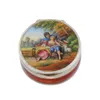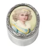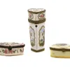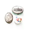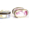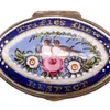 A 19th century enamelled pill box, of oval shape with cover titled "May all Nations be free and be happy like we" with love bird design, and mirror inside cover, approx. 4.2cm wide; a Continental porc…