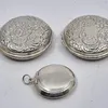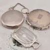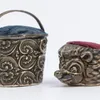 Two sterling silver pin cushions. One formed in the shape of a handbag or doctors case with openwork arabesque design; the other a circular embossed design, featuring shells and scrolls, and marked f