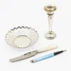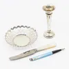 A miniature silver tulip vase, height approx 75mm, maker W.W.M, Birmingham 1989 along with a small silver pin dish with pierced decoration, Walker & Hall, Birmingham 1940, a sterling blue guilloche en…