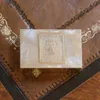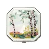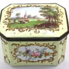 An 18th century enamelled table vanity or snuff box, of octagonal form with decorated with gilt scroll work and landscape scene to cover, side panels with floral design, all to a yellow ground, with m…