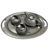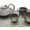 An 'Archibald Knox for Liberty & co Tudric' English pewter tea set circa 1900 consisting of sugar pot, milk jug and tea pot alongside and an Arts & Crafts Roundhead hammered pewter serving tray with h…