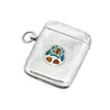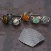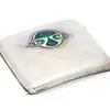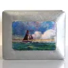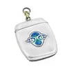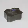 A Liberty and Co pewter hinged box and cover, of rectangular form with canted corners and concave edges, the lid with four decorative indemtations surrounding a circular blue enamel roundel, 8cm wide