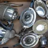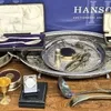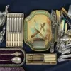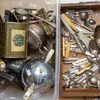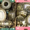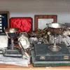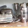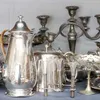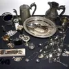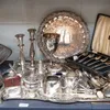 A collection of silver plated wares, pewter, flatwares and two 1950,s mantle clocks.