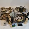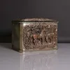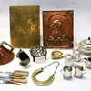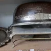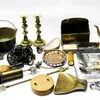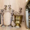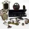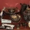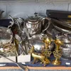 Collection of metal wares including silver plated tea set, flat wares, brass wares including candlesticks, jam pans etc, vintage tins, brass bell, candle box, along with horse bridles and yolk , wear …