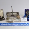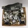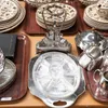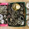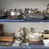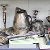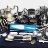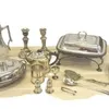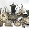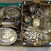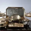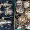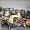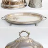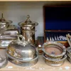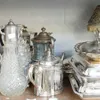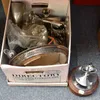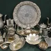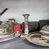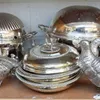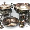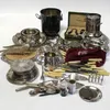 A collection of silver plated food warmers, food covers, trays, flat wares, meat platters, coffee pots, trinkets and more. (2 boxes)