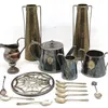 A collection of mixed items to include: a plated tea set with Bueckers Hotel crests; a plated helmet-shaped cream jug; plated apostle spoons; other spoons; pair of tall brass vases and a hallmarked si…