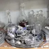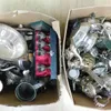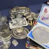A collection of silver plated wares to include: oval warming tureen and rolling cover; mixed tea or coffee pots; handled centre bowl; champagne goblets; dishes and more. (2 boxes).