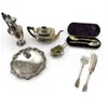 A collection of silver plated items, condiments, cased items, posy vases, flatwares, toast rack etc