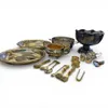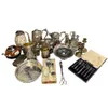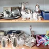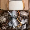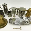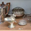 A selection of silver-plated and other metalware to include: a plated tea set; other plated items; two copper stove-top kettles with wicker handles; plated sugar scuttle; Indian brass ashtray; horn ha…
