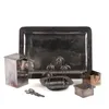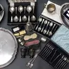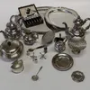 A collection of silver plated items including coffee pot, tea pot, milk/sugar bowls, serving tray, coasters, cigarette box, hair brush/mirror, hip flasks & other items. Plastic tray not included, brin…