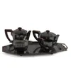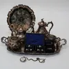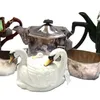 Three Novelty teapots, comprising a Snooker Table, Swan and a safe, also a silver plated tea set comprising a teapot, sugar bowl and milk jug. (6)