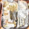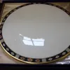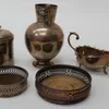 Quantity of silver plated and other items items comprising: Set of six mother of pearl handles stainless steel knives, two silver plated gravy boats, one silver plated tray, an EPNS basket tray, silve…