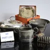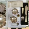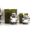 A FRENCH CHRISTOFLE FOUR PIECE TEA SET (4) — Comprising; a teapot, a sugar bowl and cover, a milk jug and a small tray, with two boxes and four brown pouches