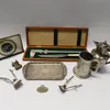 A collection of silver plate comprising tea pots, a single candelabra other items. Together with an ebony wood dressing table set. To include a WMF pierced work dish and a selection of plated cutlery.…