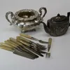 Two early 20th century silver plate teapots, together with early 20th century cased and uncased flatwares and serving tray
