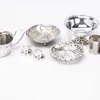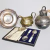 A selection of silver plated, stainless steel and pewter items; to include a Walker and Hall silver plated teapot, sugar bowl and milk jug, two silver plated ladles, a silver plated initialled cigaret…