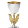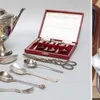 A selection of plated wares comprising: two boiled egg silver plated serving stands, spoon warmer of shell shape by Roberts & Belk, a plated and glass condiment set, flatware and a modern plated eagle…