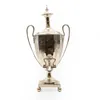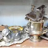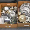 A collection of silver plated food warmers, plated dishes, samovar, pots, cream jugs and more. (2 boxes)