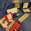 A collection of silver plated items including tea pots, tray, spoons, dish with a box of plated flatware.