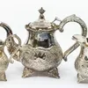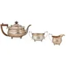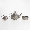 An Eastern silver plated three piece tea set, all with globular bodies finely chased and engraved with foliage and leaves, sitting upon ornate splayed feet, with decorative handles, each marked "Silve…