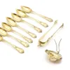 A set of twelve white metal teaspoons with tongs together with a plated teapot, flatware, a table gong, brass bowl and other items