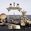 A silver plated four piece tea and coffee set with elaborate engraved detail, along with another silver plated part coffee set by Ashberry & Sons; goblets and other plated wares, together with brass/c…