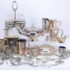 A collection of silver plate decorative items. To included a footed salver; serving dishes; an etched glass claret jug; candlesticks and other items. Some nicks and dents plus some tarnishing, one can…