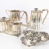 A small collection of silver plated tea and coffee pots along with cream and sugar bowls, all matching design with ribbed or gadrooned bodies. (1 box)