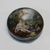 A circa 1920's silver gilt and enamel compact of disc shape. The hinged cover decorated with an amorous female couple and Cupid in a landscape, vacant interior with mirror. Import marks, 5cm