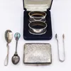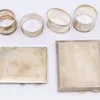 A George V silver cigarette case, Birmingham 1927 together with a case set of four Edwardian salts and spoons 1903, six various silver napkin rings total weight 140g, and two white metal South America…