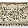 An Edwardian silver gilt cigarette box, having relief figures in tavern scene to cover and body with embossed foliate design, hallmarked by Nathan & Hayes, Chester, 1902, also with gilt interior, appr…