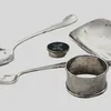 A selection of silver to include: a George V silver christening mug, hallmarked by Henry Williamson Ltd, Birmingham, 1925, approx. 6.9cm high; a George V silver small capstan inkwell, hallmarked by La…