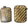 Two Japanese Meiji period brass vesta cases, one decorated with waterfowl among lily pads, the other with dragon and heron, together with a Dutch oval section vesta with applied copper side depicting …