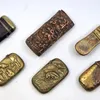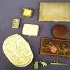A group of small collectors items including jade match box cages, French boxwood vesta, tortoiseshell cigarette case, cinnabar lacquer and gilt metal Chinese match box cage etc