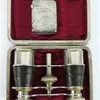 A late 19th century silver vesta case, 1896, and a cased pair of leather bound opera glasses in a leather case.