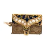 A VICTORIAN BLUE ENAMELLED AND SEED PEARL PENDANT VINAIGRETTE — The front opening to reveal a scroll pierced grille, having engraved decoration, the exterior formed as a pouch, mounted with seed pearl…